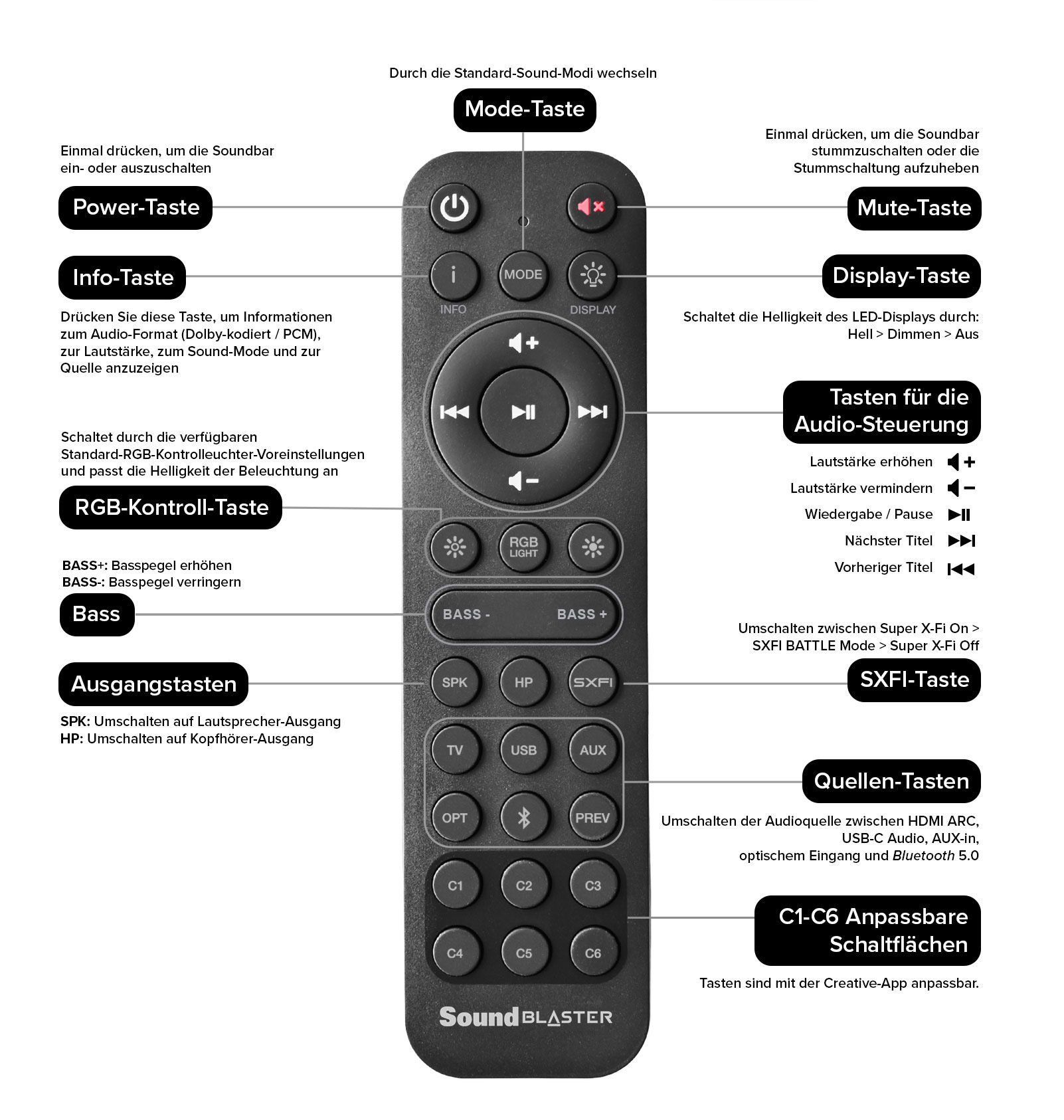HDMI ARC, USB-in, Optischer Eingang (Toslink), Aux-Eingang, Kopfhörerausgang, SXFI-Ausgang, AC Wall Plug, DC-in