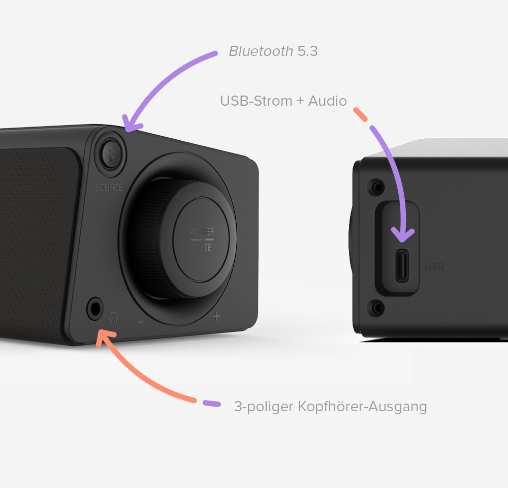 Die Creative Stage SE mini wird über USB-C mit Strom versorgt und unterstützt Bluetooth 5.3. Schließen Sie die Soundbar einfach an ein unterstütztes Gerät an und schon kann es losgehen!