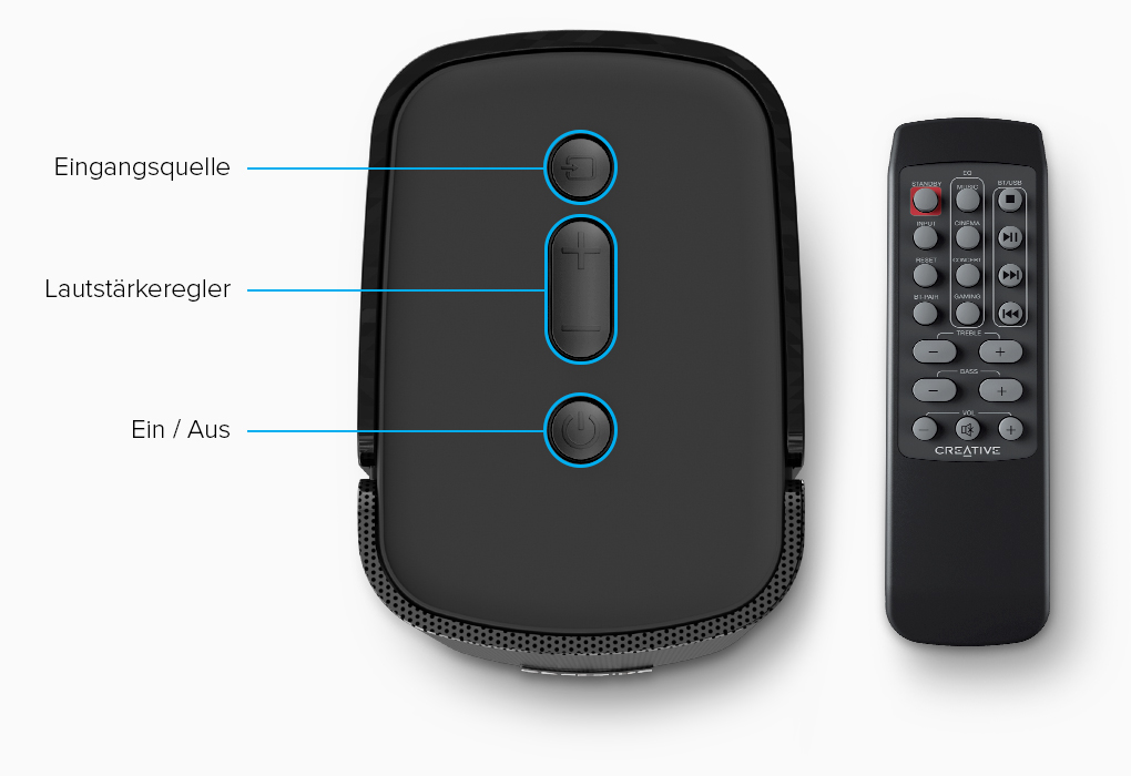 Komfortable BedienelementeKabellose Fernbedienung mit voreingestellten Equalizern und anpassbaren Bass- und Höheneinstellungen